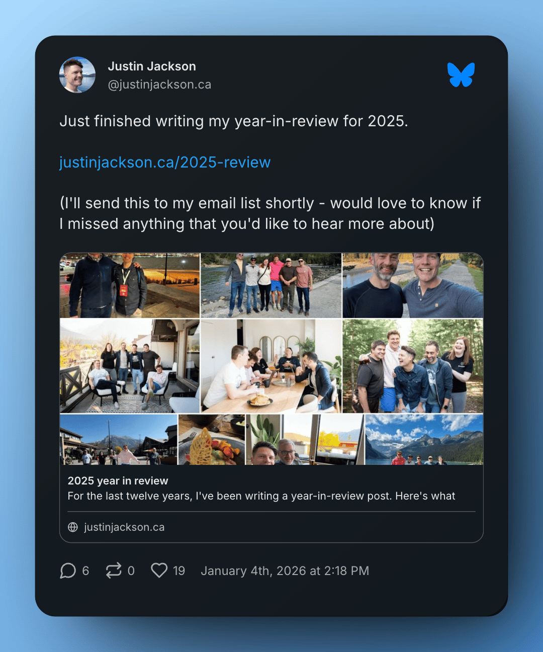 Bluesky Directory Newsletter Bluesky currently has over 41.5M users320K starter packs, 105K feeds & 300K lists Year in review Many users on Bluesky have been posting their recaps of 2025, some selected posts: https://bsky.app/profile/justinjackson.ca/post/3mbmnc4wzu22e https://bsky.app/profile/davatron5000.bsky.social/post/3mbgaxwf5hk2d https://bsky.app/profile/rachelandrew.bsky.social/post/3mbmpzqh3yc2p https://bsky.app/profile/mcfaulmike.bsky.social/post/3mbhpexto7k2c Find many more via...